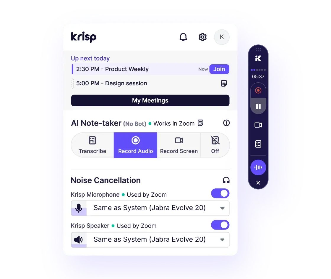 - Krisp: Focuses on improving meeting audio quality. Built around noise cancellation, with recording, transcription, summaries, and action item extraction layered on top.