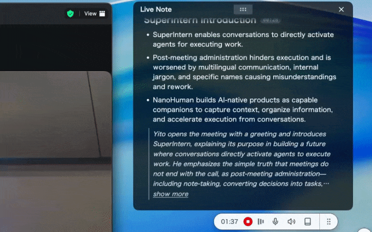 - SuperIntern: Focuses on improving meeting understanding. Designed to continuously display real-time summaries and translated captions during the meeting.