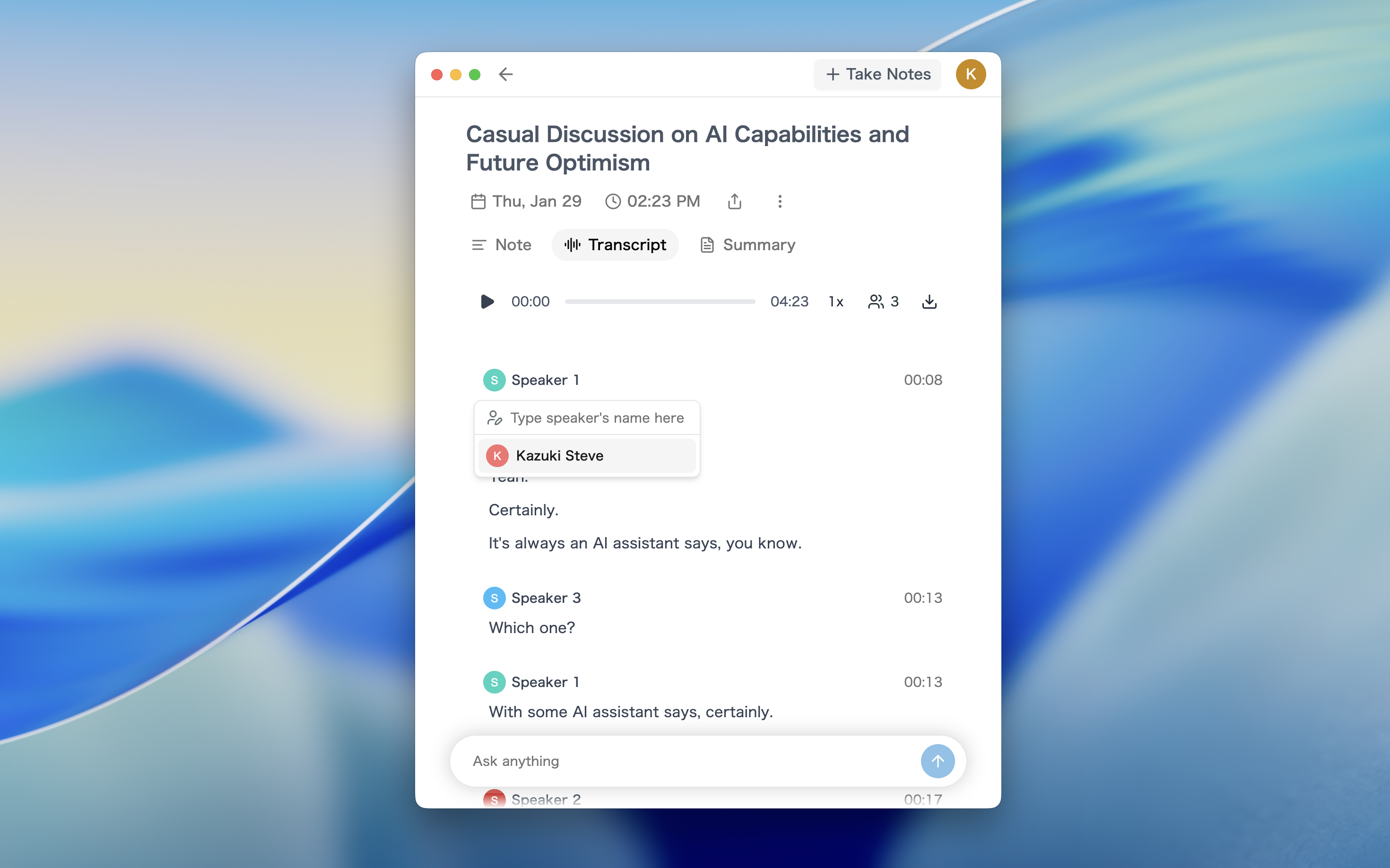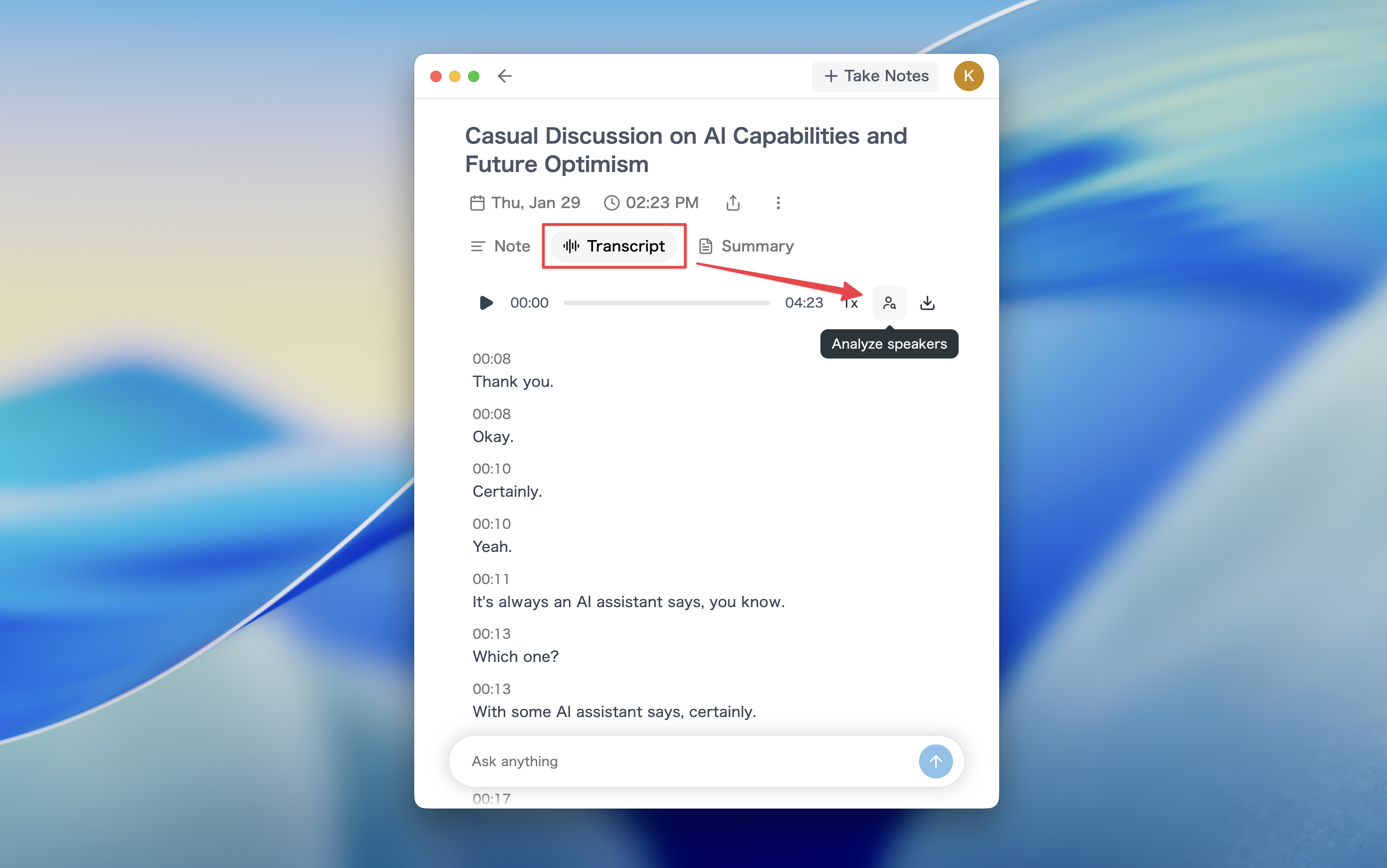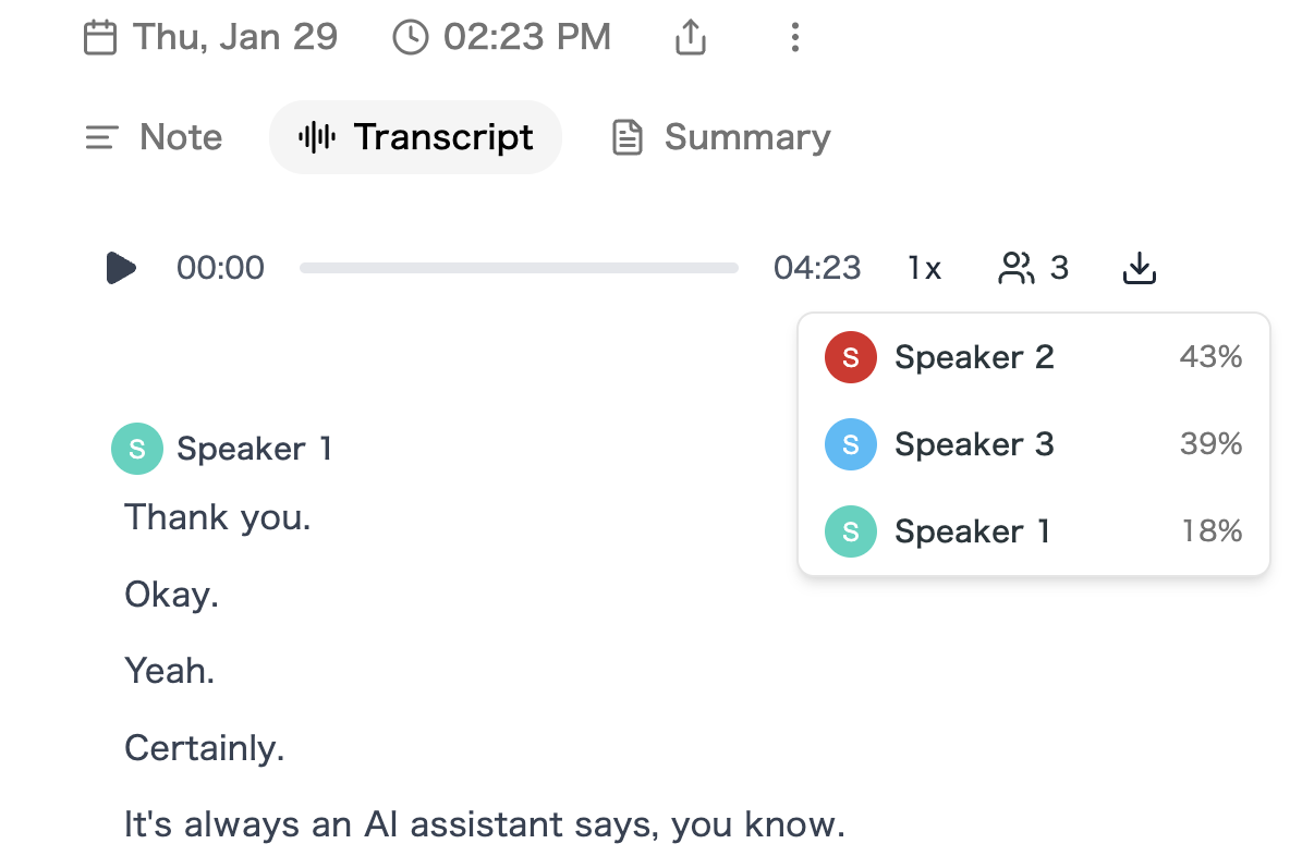 - Speaking time display: See what percentage each speaker contributed to the conversation