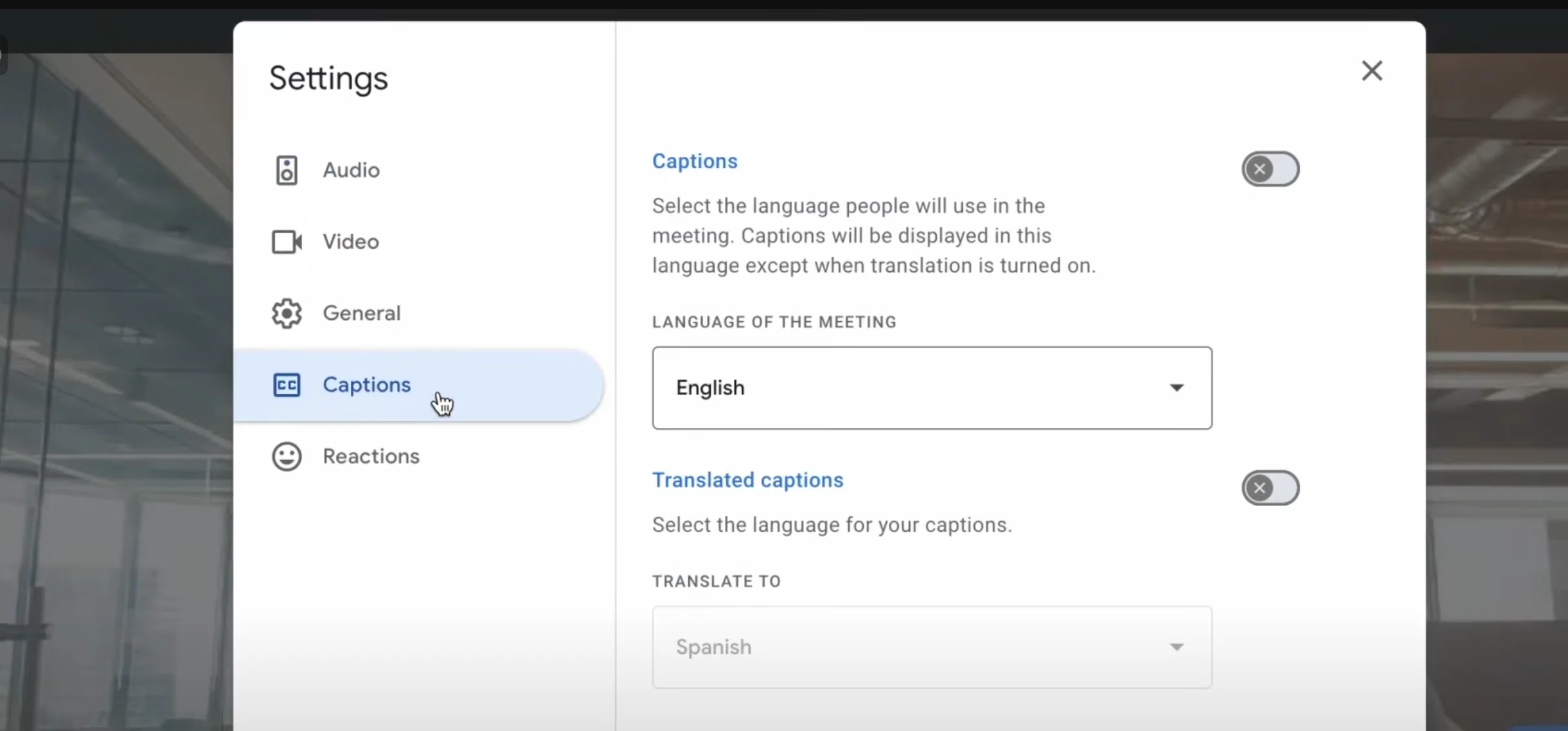Google Meetには「字幕翻訳(Translated Captions)」という機能があり、会議中の発言をリアルタイムで別の言語に翻訳して字幕として表示できます。